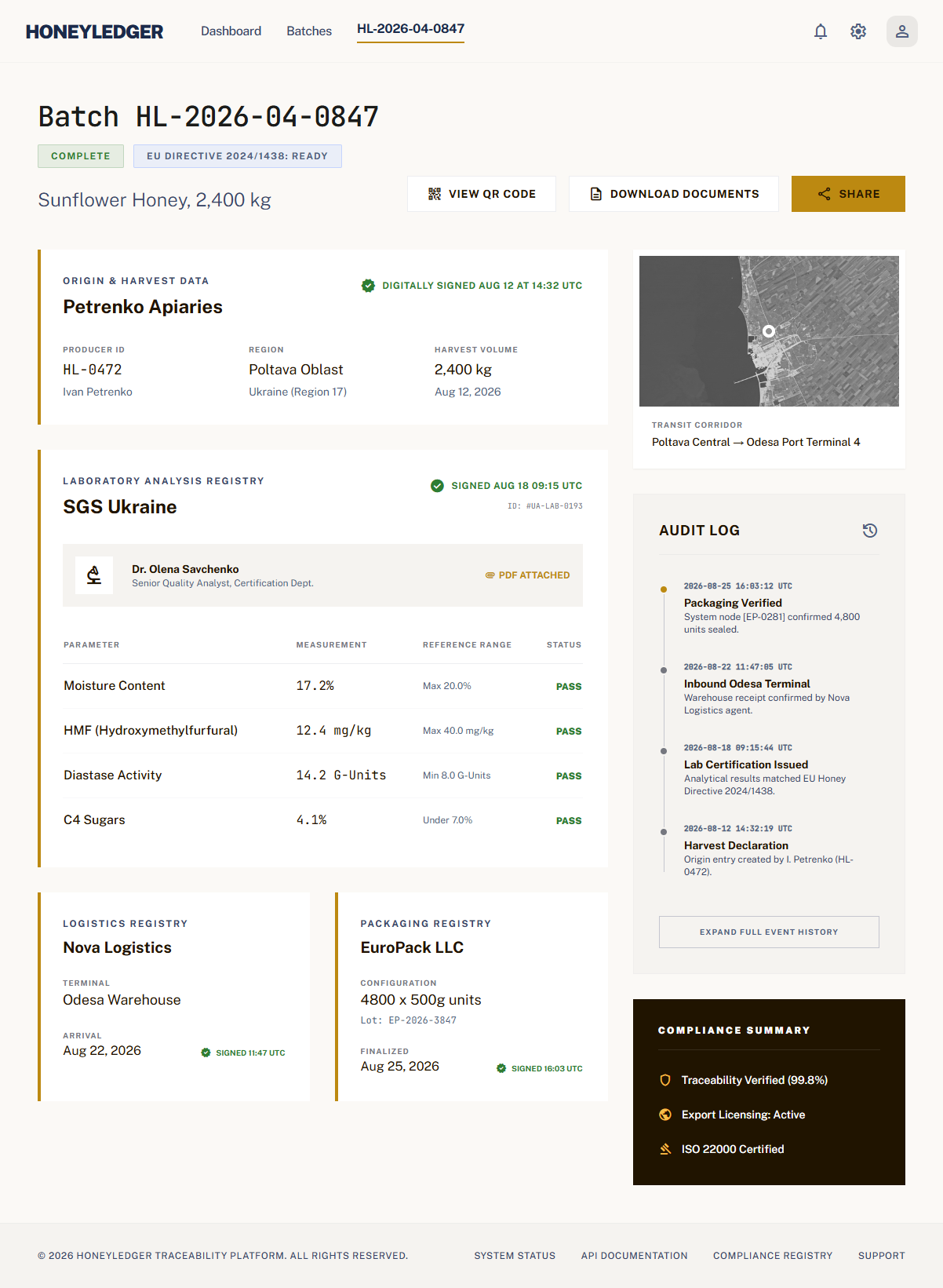 HoneyLedger is a register. Every handoff in the supply chain — beekeeper, laboratory, logistics, packer — is recorded as a signed, tamper-evident entry. The platform guarantees immutability. The participant guarantees honesty. The two responsibilities are kept separate by design.
